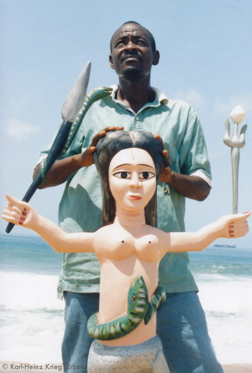 Voodoo-Schnitzer Koffi Agbédégpé mit einer von ihm geschnitzten Mamy Wata-Figur. Foto: Karl-Heinz Krieg
